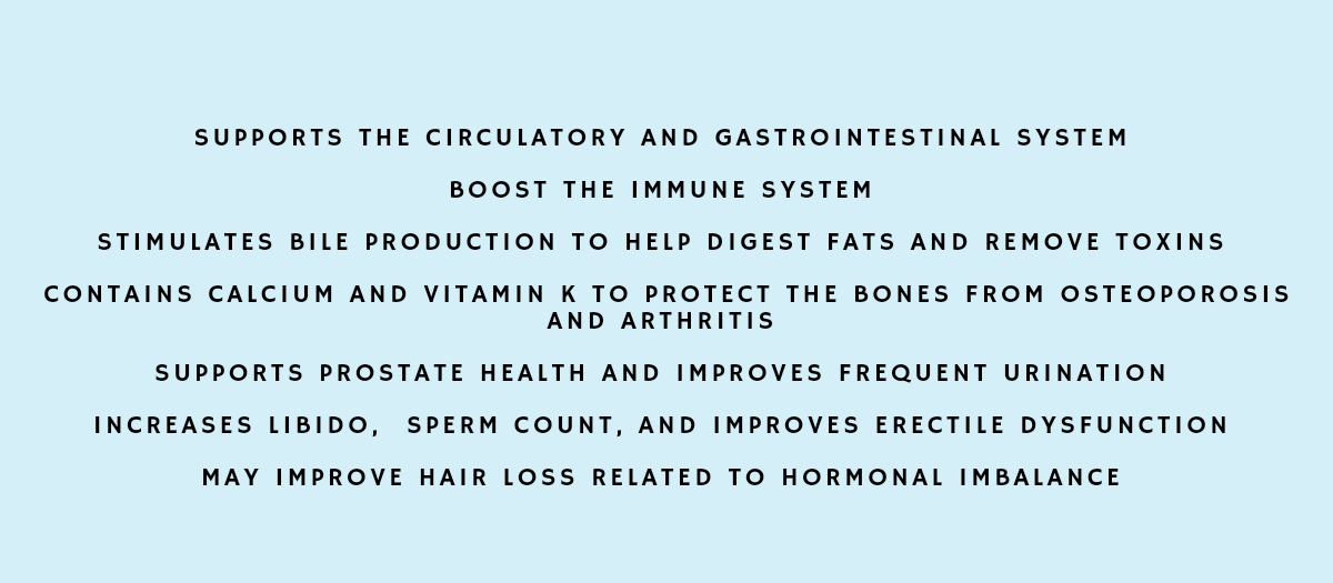 Saw Palmetto- is used for prostate swelling, prostate cancer and other prostate problems. It improves the need for frequent urination. Saw palmetto increases libido. Can help hair loss related to hormonal imbalance. Can increase muscle mass and aid in weight gain.